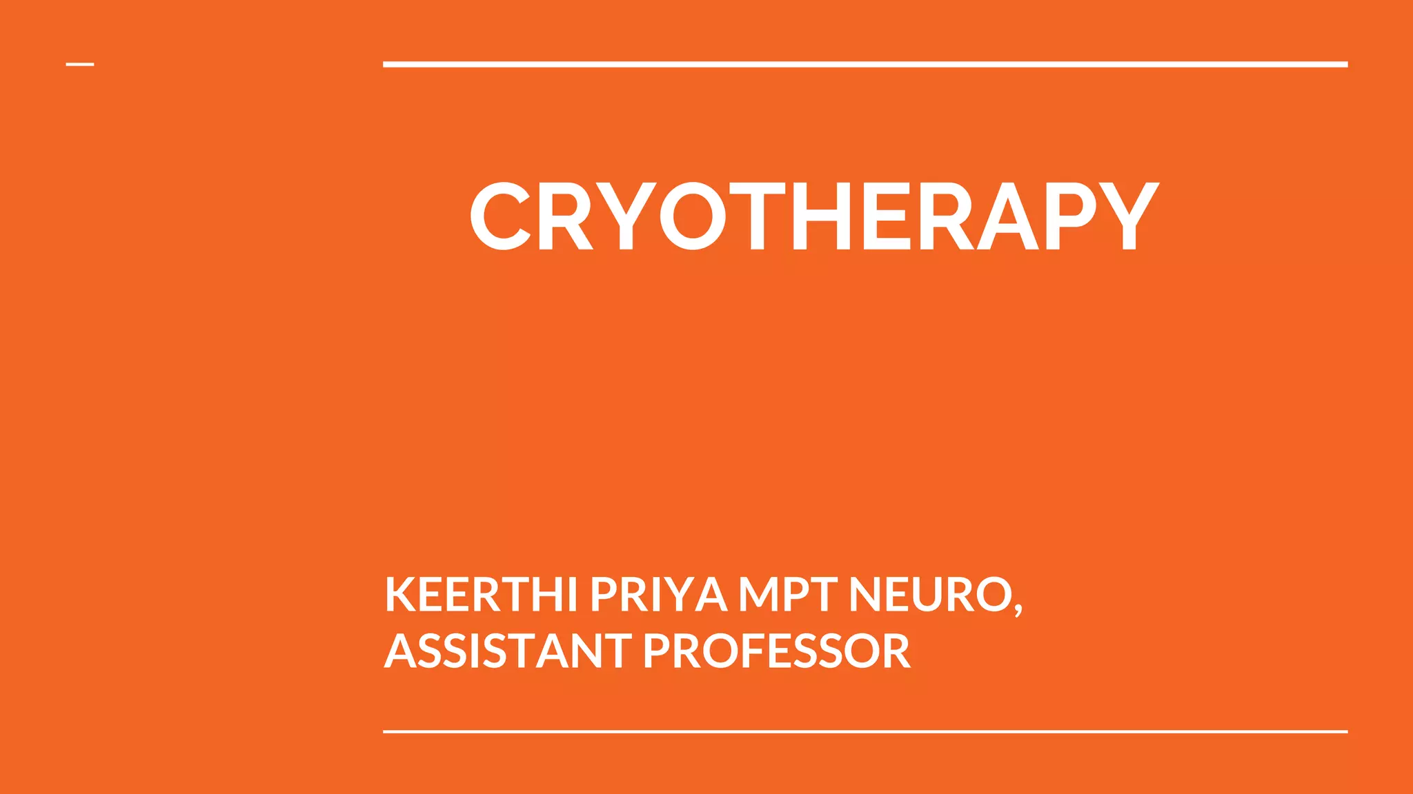 Cryotherapy refers to the use of cold for therapeutic effects in acute trauma and subacute injury. There are several types of cryotherapy including local immersion, cold packs, ice towels, ice massage, cold compression, and evaporating sprays. The physiological effects of cryotherapy include vasoconstriction followed by vasodilation in the circulatory system, decreased cell metabolism, reduced nerve conduction velocity, and decreased muscle performance. The therapeutic effects are pain relief, reduction of inflammation and edema, decreased muscle spasm and spasticity, and benefits for recent injuries. Contraindications include cardiac or peripheral vascular disease and impaired sensation.