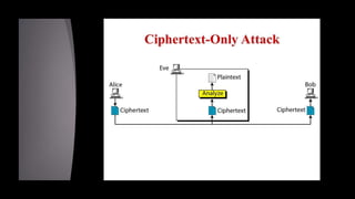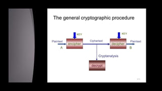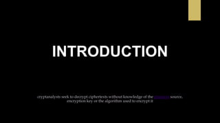 Cryptanalysis is the study of encrypted messages to understand encryption systems and find weaknesses. Cryptanalysts aim to decrypt messages without knowing the encryption key or algorithm. Their research helps cryptographers strengthen algorithms. Cryptanalysts uncover design flaws that can reduce the number of keys tested on a message. Their work is used by governments and companies to test security products.