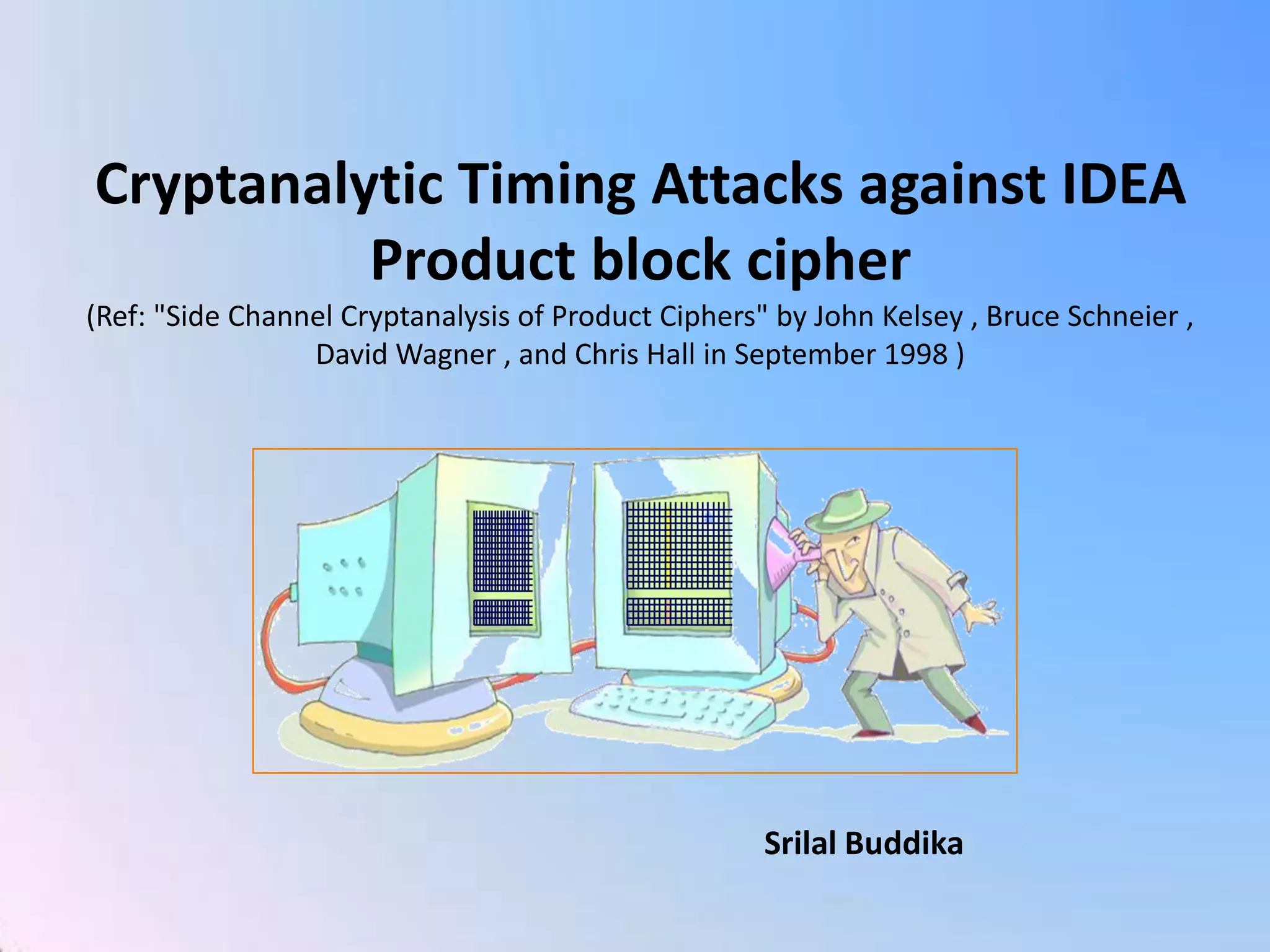 This document summarizes a timing attack against the IDEA block cipher. It describes how precise timing measurements of encryptions can reveal information about the secret key. The attack analyzes timing differences between encryptions to determine when operations like multiplication involve a zero value. This leaks key bits over multiple rounds of the analysis. The attack can recover the full 128-bit key without knowledge of the plaintext.