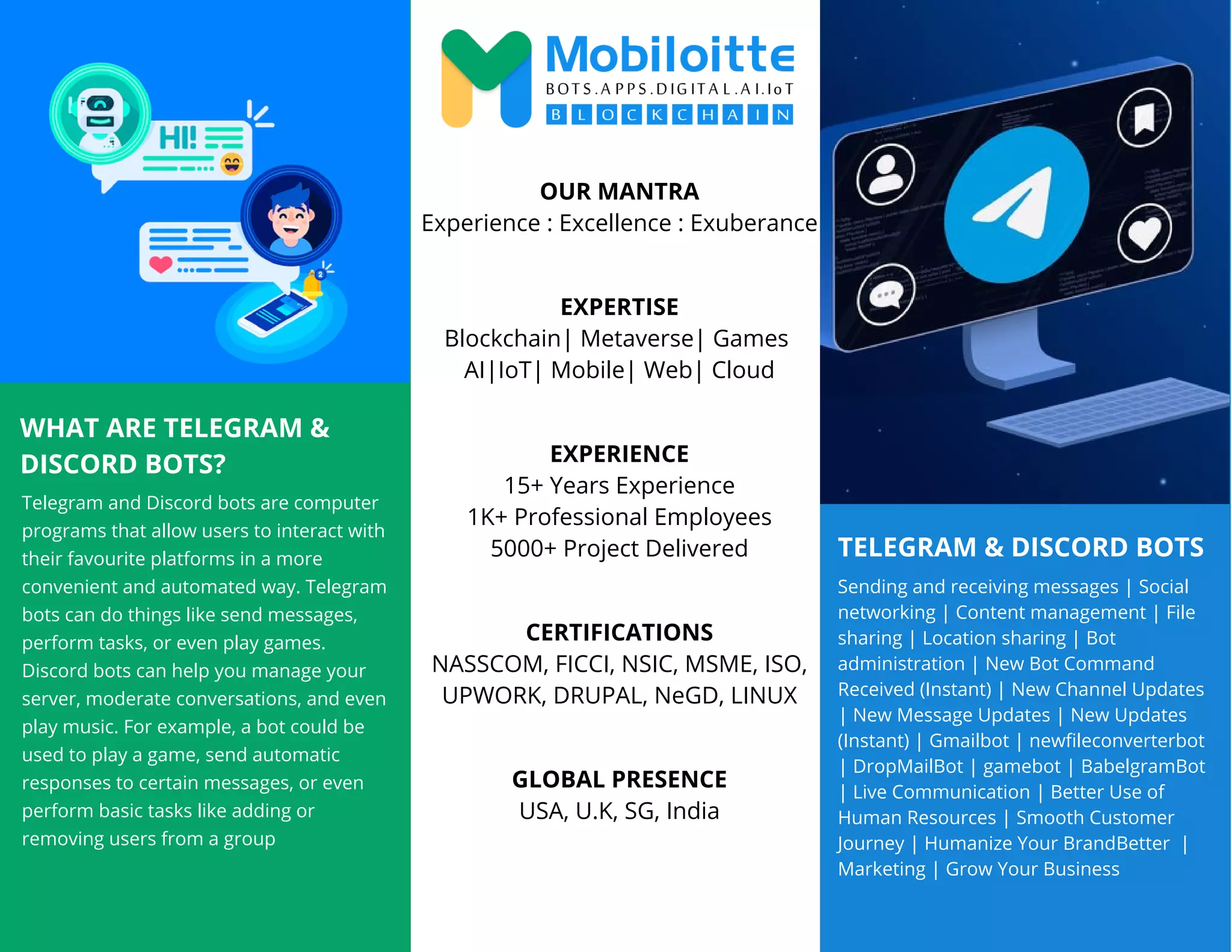 Telegram and Discord bots are automated programs that enhance user interactions on these platforms by performing tasks such as sending messages and managing servers. Mobiloitte offers custom bot development and integration services, enabling businesses to automate various processes and improve customer experiences. With over 15 years of experience, Mobiloitte provides a range of bot services tailored to the unique needs of clients.