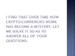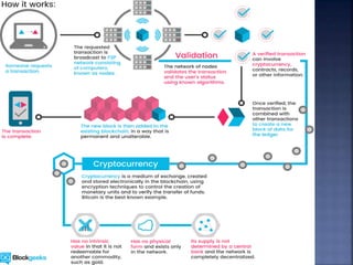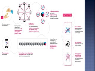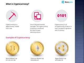 Cryptocurrencies like Bitcoin emerged from the invention of blockchain technology, which allows for a decentralized digital ledger system without a central authority. The first cryptocurrency, Bitcoin, was created in 2008 by Satoshi Nakamoto as a peer-to-peer electronic cash system without central control. Cryptocurrencies use cryptography to securely record transactions on distributed ledgers called blockchains, preventing double spending without central servers. Their values are determined by the market rather than controlled by governments.