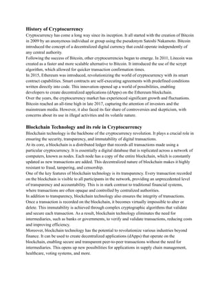 Cryptocurrency such as Bitcoin has introduced a "quantum leap" in finance by providing a decentralized digital currency that operates independently of any central authority. The document discusses the history and fundamentals of cryptocurrency, how blockchain technology secures transactions, advantages like low costs and global access, challenges around regulations and volatility, and emerging trends driving further innovation such as decentralized finance. The quantum leap in cryptocurrency has potential for significant impacts such as increased financial inclusion, reduced costs of international payments, and bringing greater transparency to financial systems.