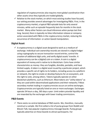 This document discusses pump and dump (P&D) schemes in the cryptocurrency market. P&Ds artificially inflate asset prices before selling at a higher price, causing prices to fall and investors to lose money. The document analyzes P&D events in cryptocurrencies, finding evidence of price run-ups before P&Ds and increased volatility and liquidity issues after bans on P&Ds by exchanges. It examines the characteristics of P&Ds in cryptocurrencies compared to stocks, including their short duration and lack of false information.