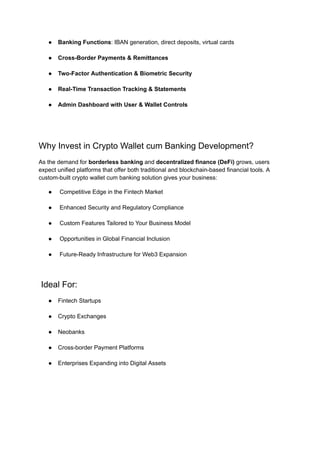 A Crypto Wallet cum Banking Solution combines the features of a traditional digital banking system with the decentralized, secure functionalities of a crypto wallet. This integrated platform allows users to store, manage, transfer, and convert both fiat and cryptocurrencies, bridging the gap between legacy finance and the blockchain world.