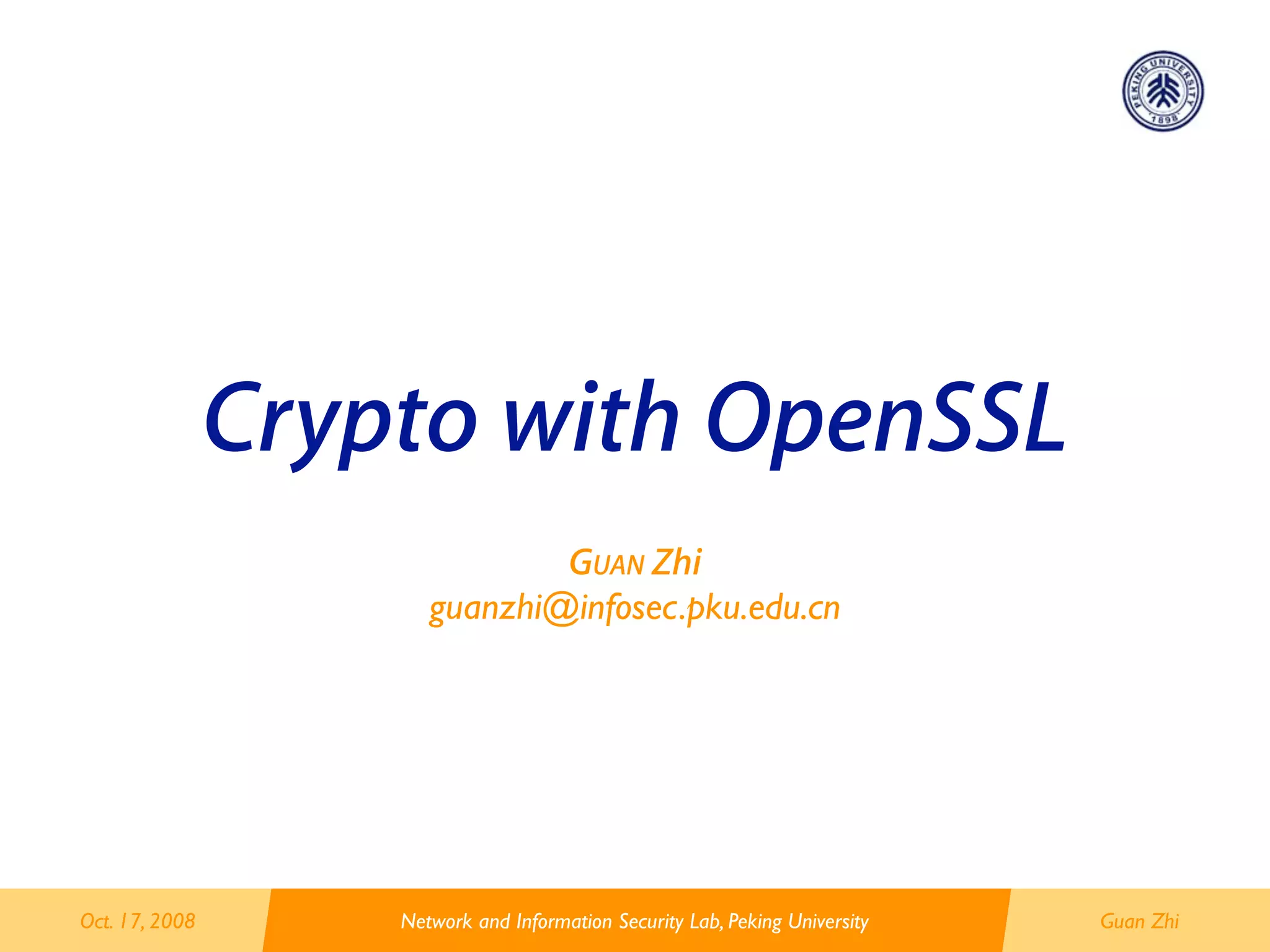 This document provides an overview and introduction to OpenSSL including its components, architecture, APIs and usage. It describes OpenSSL as an open source cryptography toolkit that implements SSL/TLS protocols as well as cryptographic functions for encryption, decryption, signatures, certificates etc. It outlines OpenSSL's command line interface, supported algorithms, license, source code organization, EVP crypto API and usage examples for symmetric encryption and hashing.