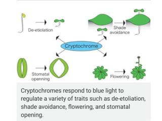Cryptochrome is a class of flavoprotein that acts as a blue light photoreceptor involved in circadian rhythms in plants and animals. It was first observed in plants in the 1800s but was not identified until the 1980s. Cryptochrome has a similar structure to photolyase but serves different functions. It contains a single molecule of FAD that absorbs blue light. In plants, cryptochrome mediates responses to blue light such as growth, seedling development, and leaf/stem expansion.