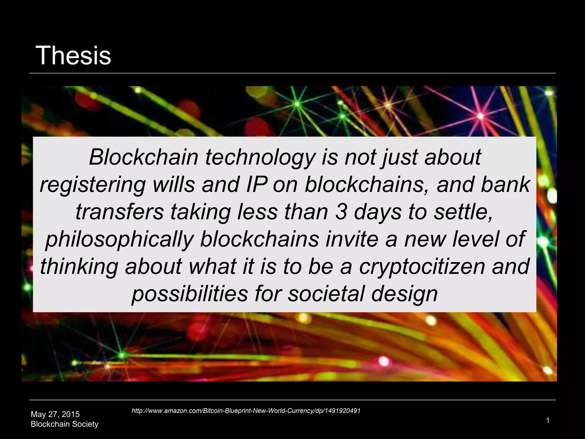 The document discusses the implications of blockchain technology beyond cryptocurrencies, emphasizing the concept of 'cryptocitizens' and the potential for societal design through smart contracts and decentralized networks. It outlines how smart property can be registered and tracked using blockchain, and the emergence of 'cryptolaw' which intersects legal frameworks with technological execution. The author posits that blockchain can revolutionize trust and authority relationships in society, transforming governance and individual autonomy.