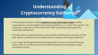 The document compares cryptocurrency exchange scripts based on the Coinbase and Binance platforms, highlighting their functionalities, user interfaces, security features, and scalability. Coinbase clone scripts cater to beginners with a user-friendly interface, whereas Binance clone scripts target professional traders with advanced trading capabilities. Both scripts require maintenance, but Coinbase is easier to manage, while Binance demands more frequent updates to support its complex features.