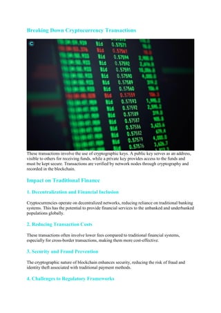 Cryptocurrency, founded by Bitcoin in 2009, is a decentralized digital currency that utilizes blockchain technology to offer transparency, security, and reduced transaction costs, challenging traditional finance. As its adoption grows, it faces regulatory uncertainties and market volatility while also promoting financial inclusion and innovation through developments like DeFi and NFTs. The future of cryptocurrency depends on balancing innovation with regulatory frameworks and addressing challenges of scalability and compliance.