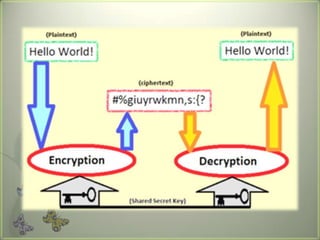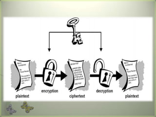 Cryptography is the practice of securing communications through techniques like encryption and decryption. It involves constructing algorithms to protect information from adversaries and ensure data confidentiality, integrity, and authentication. The main types are transposition ciphers, which rearrange letters, and substitution ciphers, which replace letters. Modern cryptography expanded with computers to encrypt any data and uses symmetric key cryptography, where senders and receivers share a key, and public key cryptography, where they have different keys. It has many applications including ATMs, email, remote access, and smart cards.