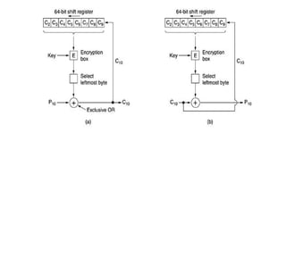 Electronic Codebook Book (ECB) encrypts each message block independently without chaining blocks together. This can reveal patterns in the ciphertext if the plaintext has repetitive blocks. Cipher Block Chaining (CBC) chains blocks together by XORing the previous ciphertext block with the current plaintext block before encryption. Counter (CTR) mode encrypts a counter value rather than feedback from previous blocks, allowing parallel encryption. These modes of operation can be used to encrypt data blocks securely depending on needs such as bulk encryption or streaming data.