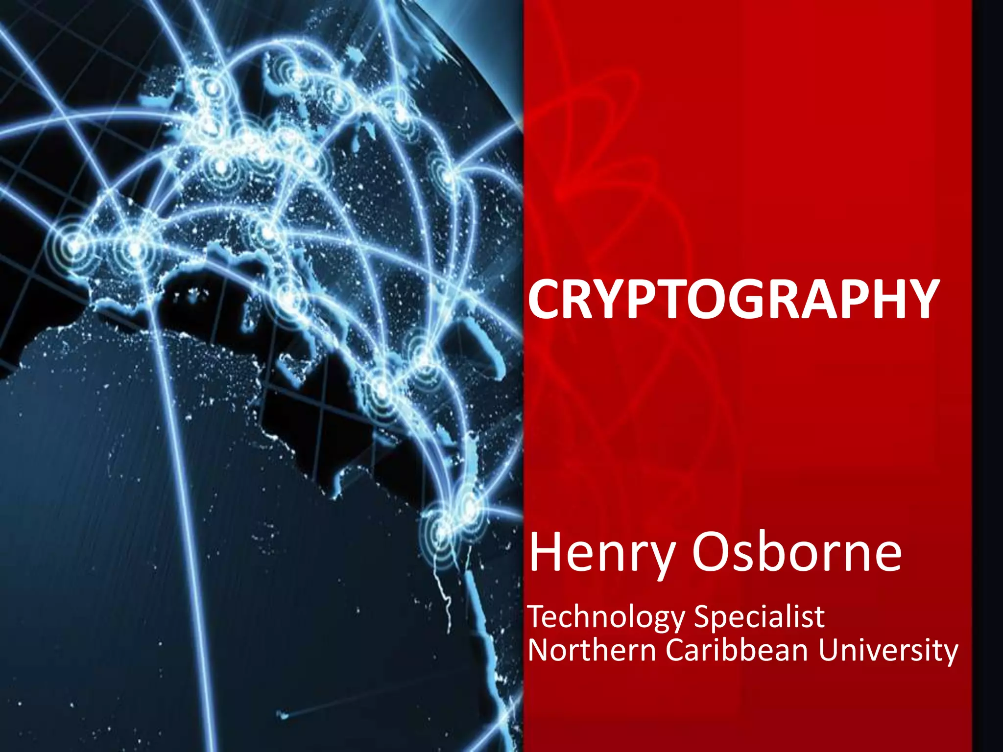 This document provides an overview of cryptography presented by Henry Osborne. It defines cryptography as the process of making and using codes to secure information transmission. It discusses key terms like ciphertext, plaintext, and key. It also summarizes several cipher methods: substitution cipher, transposition cipher (also known as permutation cipher), exclusive OR (XOR), and the Vernam cipher (also called the one-time pad). The presentation concludes by noting that while codes can secure information, human ingenuity will ultimately find a way to resolve any cipher.