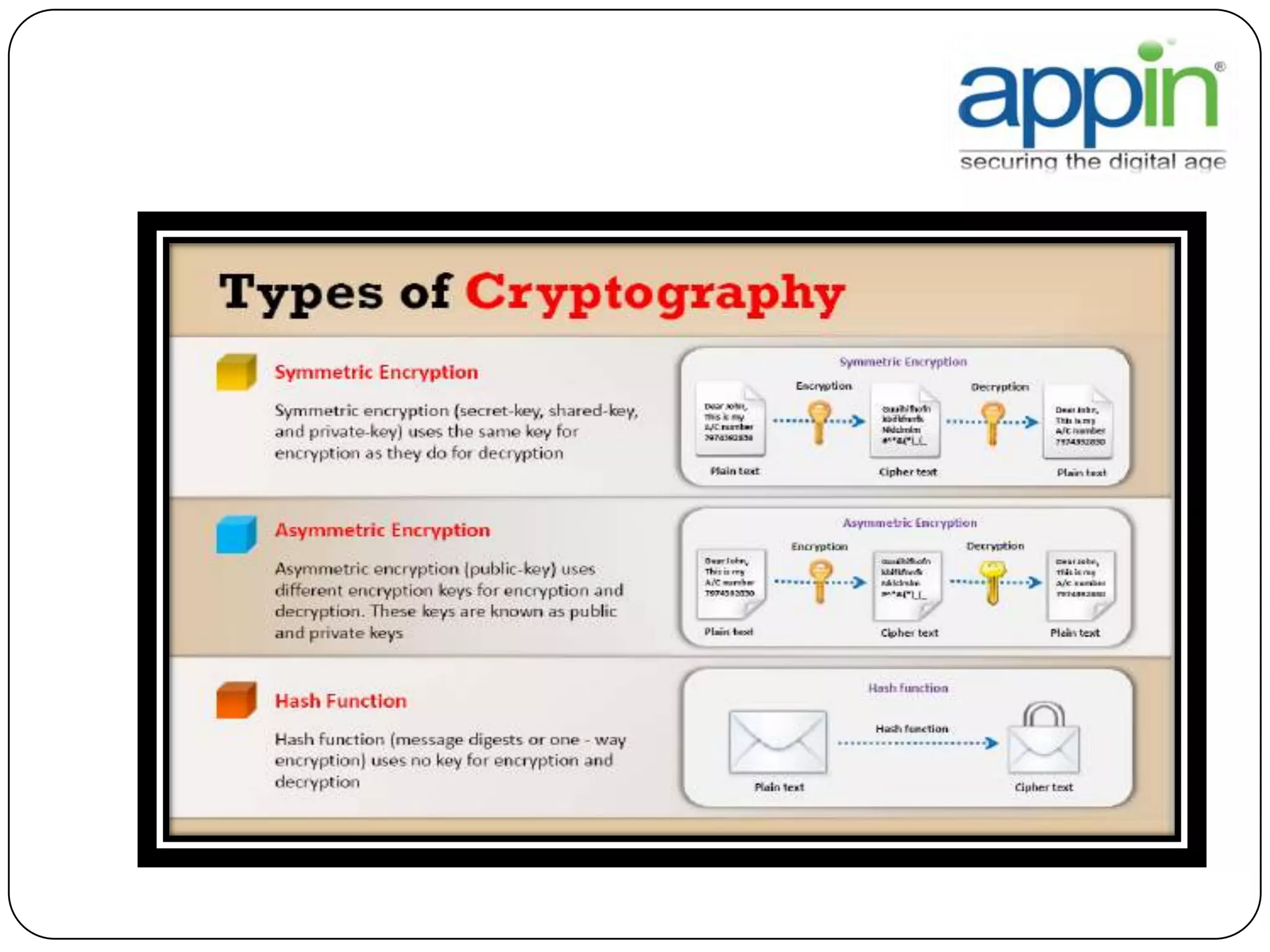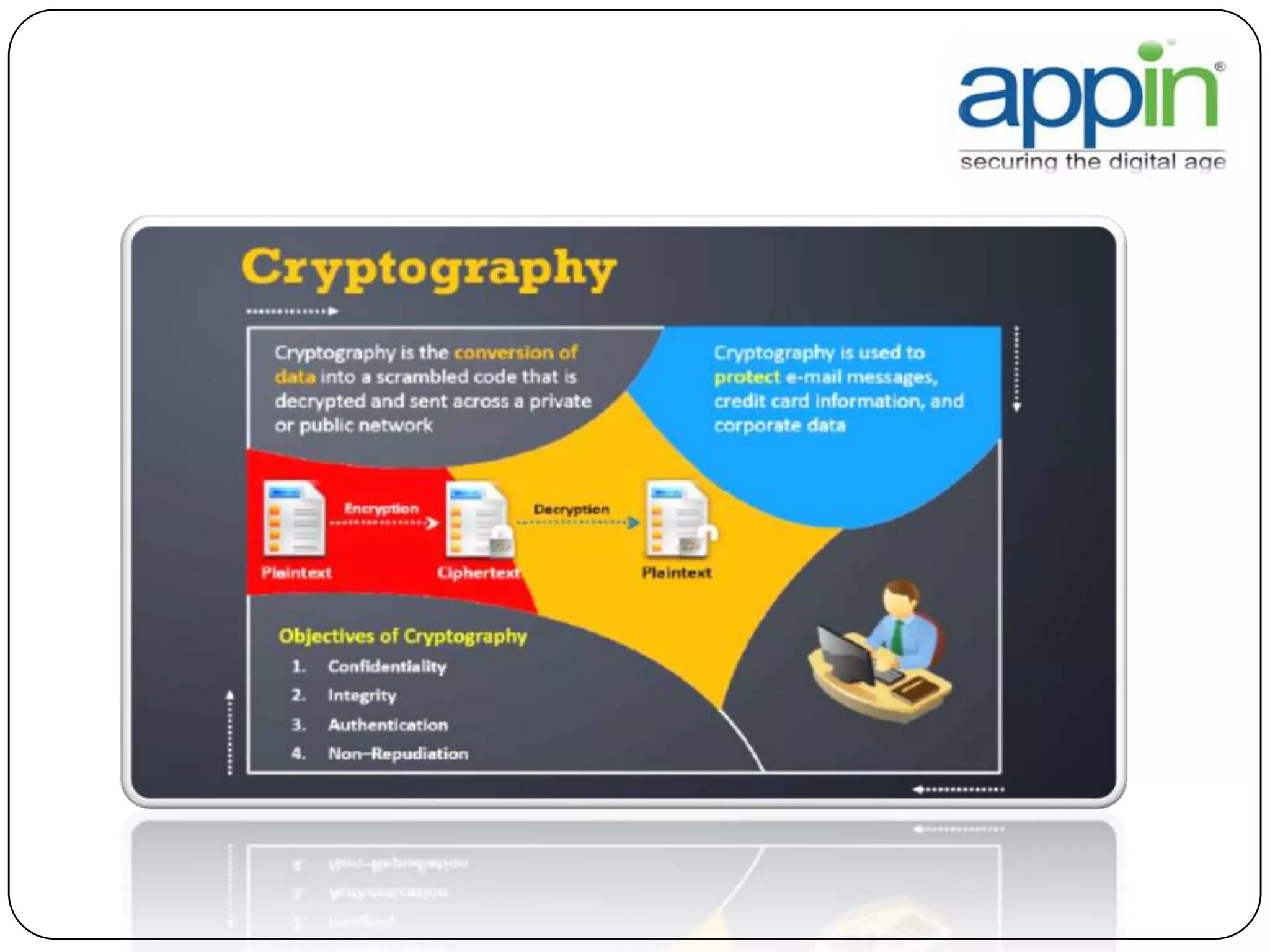 Cryptography is used to securely communicate private information and can be implemented using secret codes, ciphers, one-time pads, and cryptographic methods like symmetric and asymmetric encryption. Pretty Good Privacy (PGP) is an encryption package that uses asymmetric encryption with two keys - a private key and a public key. A message encrypted with the public key can only be decrypted with the corresponding private key, allowing secure communication between parties. PGP first compresses, encrypts with a randomly generated session key, and then encrypts the session key with the recipient's public key to securely transmit an encrypted message.