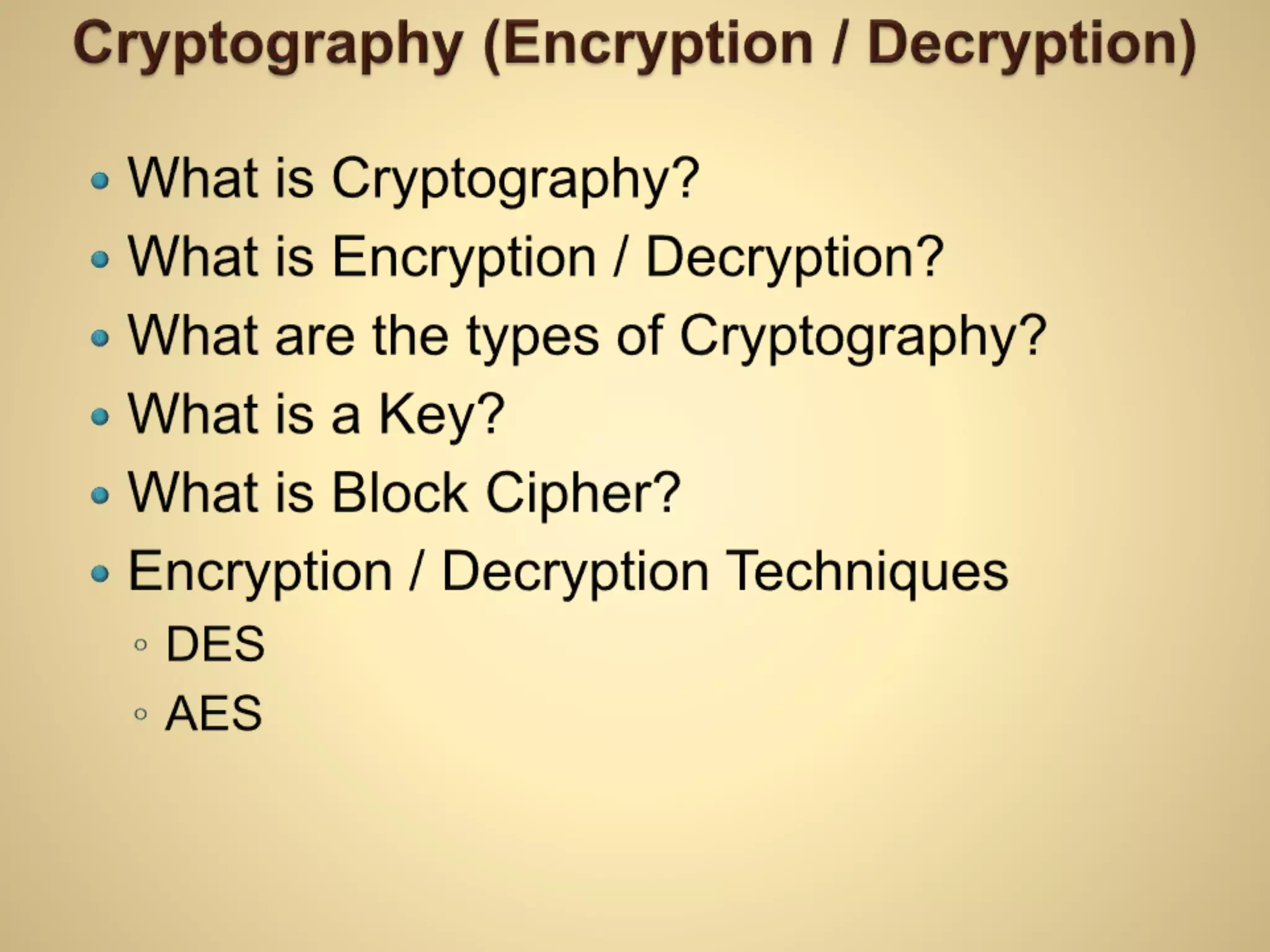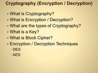 Cryptography involves encrypting data to hide its meaning. Encryption converts plain text into unintelligible cipher text using an algorithm and a key, while decryption reconverts the cipher text into plain text. Symmetric key cryptography uses the same key for encryption and decryption, while asymmetric key cryptography uses different public and private keys. AES is a modern block cipher standard that uses 128, 192, or 256-bit keys and a 128-bit block size, providing stronger security than the older DES standard with its 56-bit key and 64-bit block size. AES encryption is considered very secure due to the huge number of possible keys.