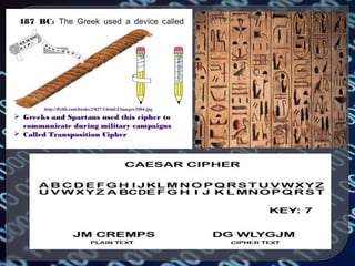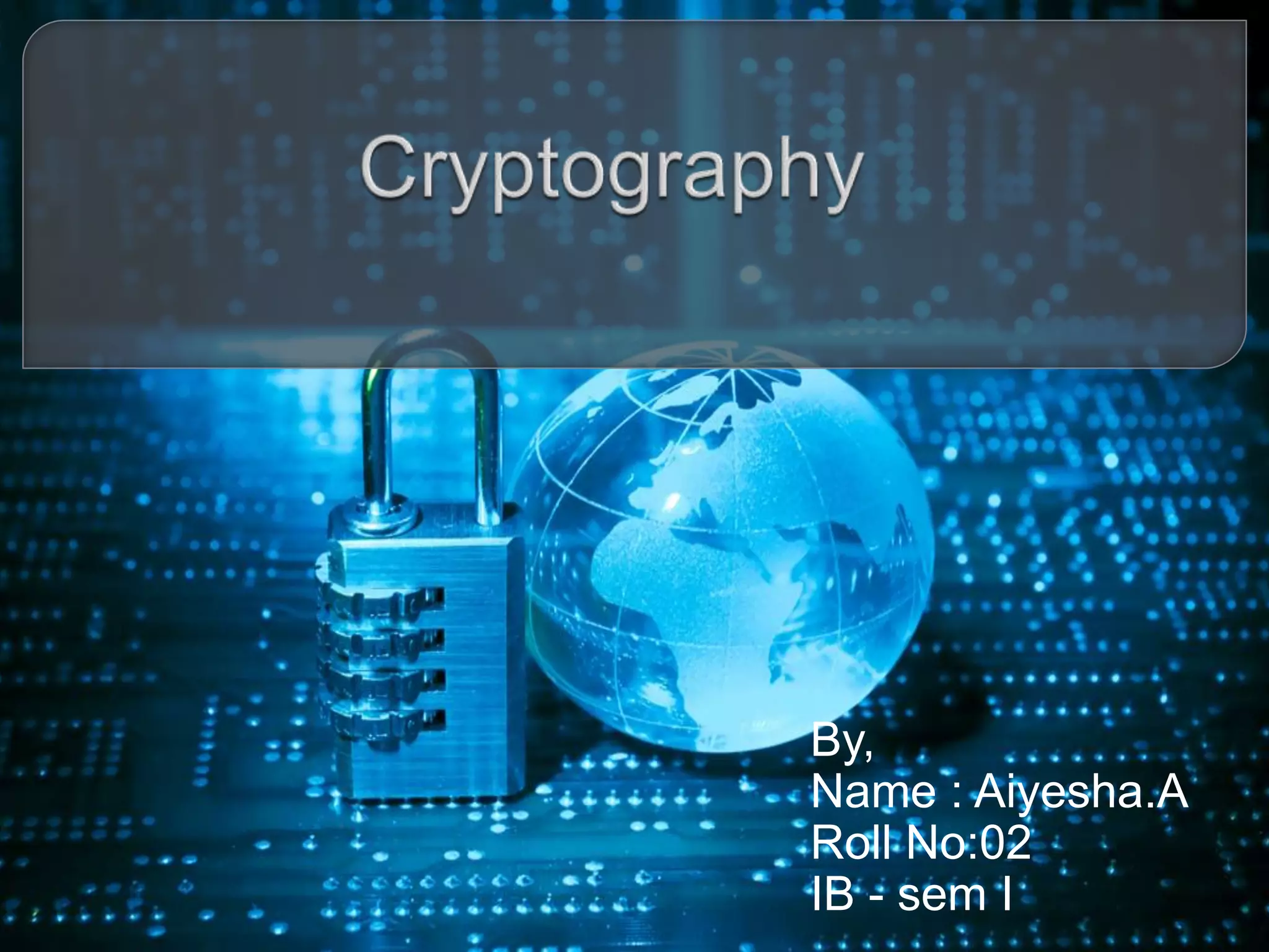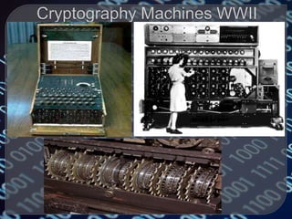 Cryptography is the practice of protecting information by converting it into an unreadable format. Only using a secret key can the information be converted back to a readable format. Throughout history, different encryption techniques have been developed including the Caesar cipher, the Vigenere cipher, and public key cryptography developed by Diffie and Hellman. Modern cryptography is used for purposes such as authentication, electronic money, secure network communication, anonymous remailers, and disk encryption. However, widespread use of unbreakable encryption could enable criminal activity and threaten national security and business interests.