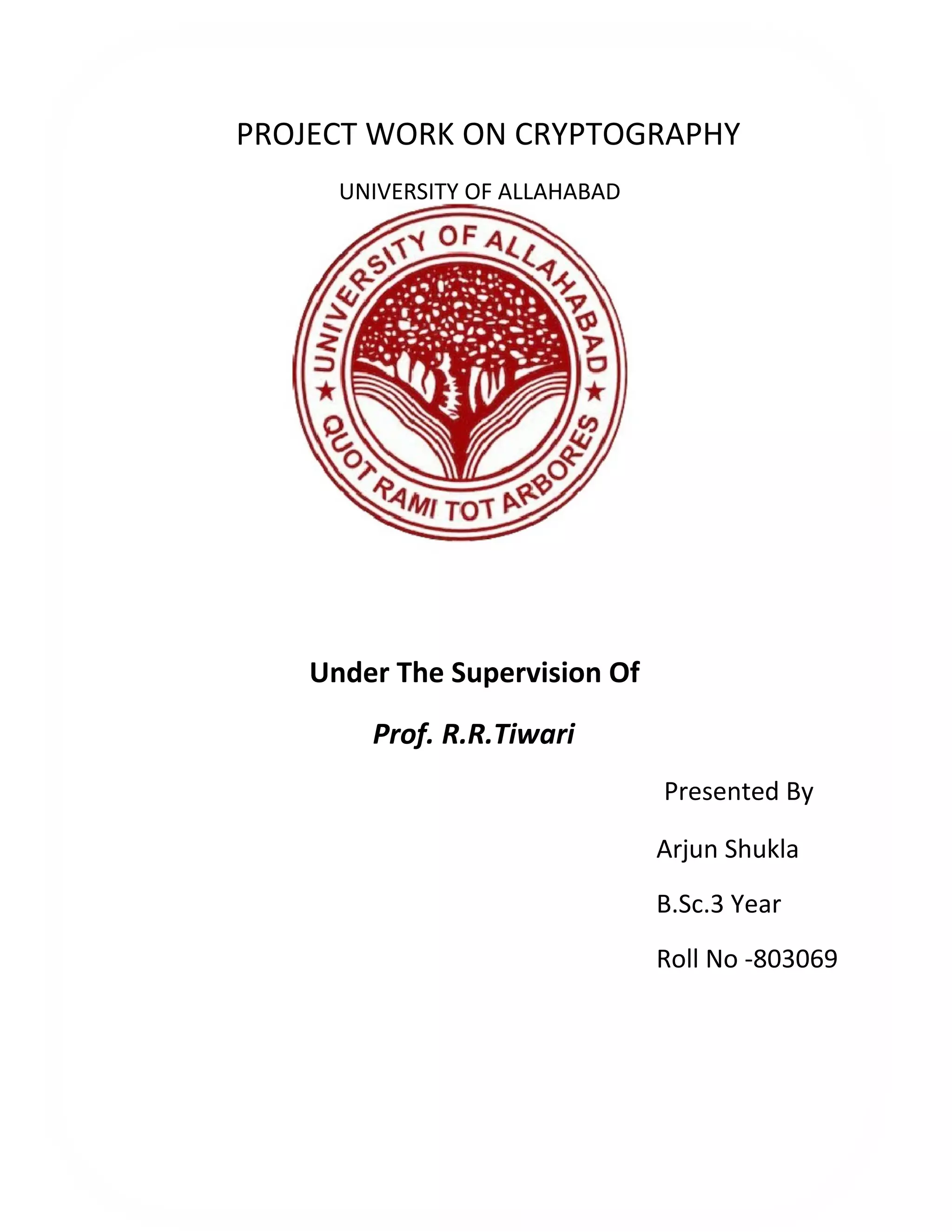 This document is a project report submitted by Arjun Shukla to his professor R.R. Tiwari on cryptography. It includes a certificate signed by Prof. Tiwari to confirm Arjun undertook the project on cryptography under his supervision. The report also acknowledges Prof. Tiwari's guidance and support. It contains an index of topics to be covered in the project report including introduction, history of cryptography, definitions, security services, attacks on cryptosystems, hash functions, applications and a conclusion.