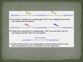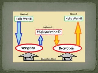 Cryptography is used to protect information by encrypting messages into an unreadable cipher text format. Modern cryptography uses either secret key cryptography, which uses a single key for encryption and decryption, or public key cryptography, which uses two mathematically related keys with one key to encrypt and the other to decrypt. The purpose of cryptography and security is to defend against hackers, industrial espionage, and to secure e-commerce, bank accounts, intellectual property, and avoid liability.