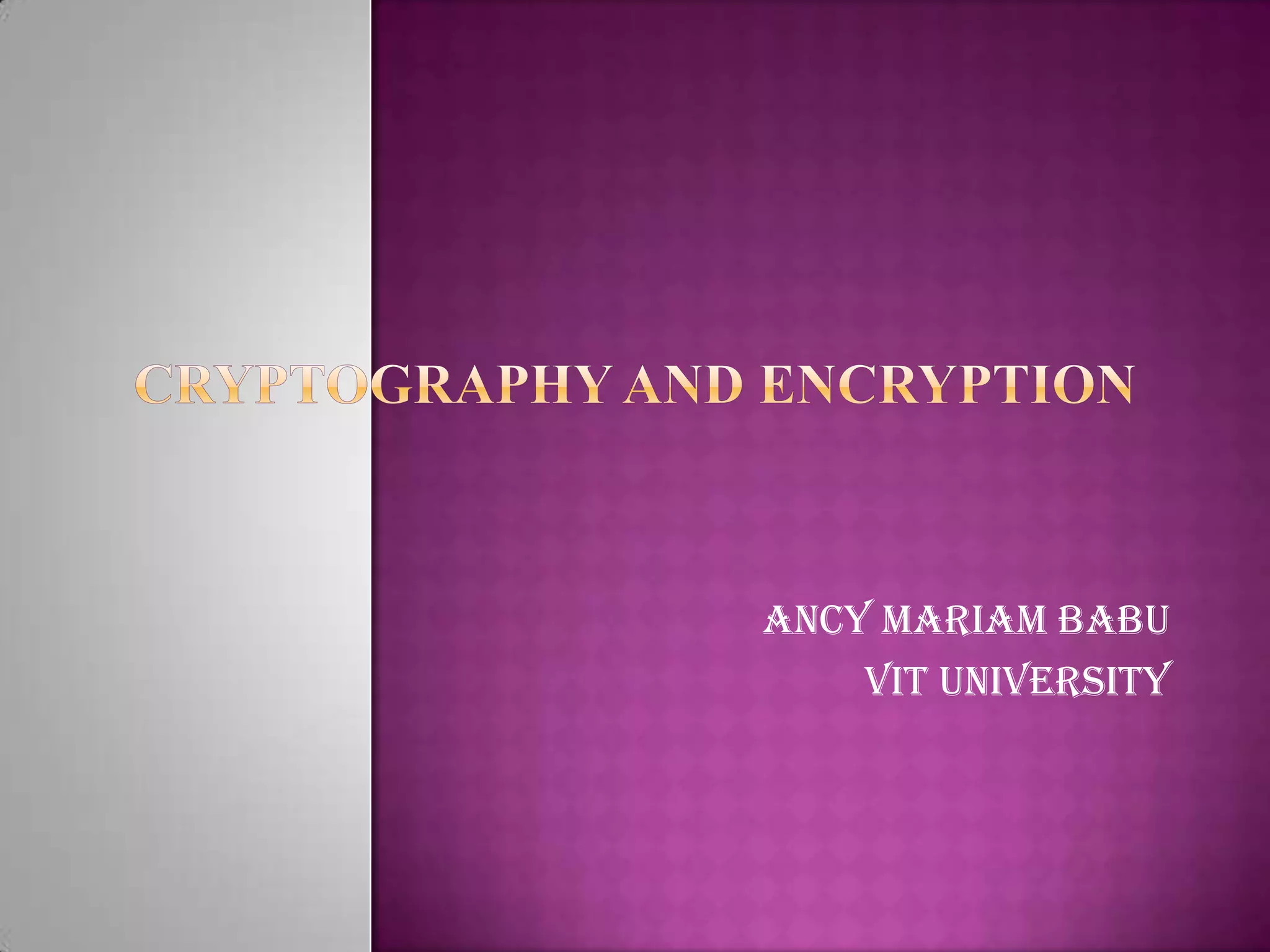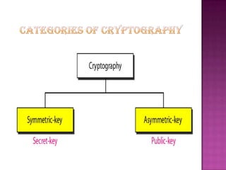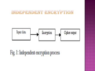 Cryptography is the science of securing information and communication through techniques like encryption. The document discusses various cryptography concepts like encryption algorithms, symmetric and asymmetric key encryption, objectives of cryptography like confidentiality and integrity, and applications of encryption like web browsing, email, and video encryption. It also compares independent encryption with joint compression and encryption techniques for securing video data.