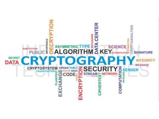 This document provides an overview of cryptography. It begins with a brief history of cryptography from ancient times to modern computer cryptography. It then defines basic concepts like encryption, decryption, plaintext and ciphertext. It describes different types of cryptography including codes, ciphers, steganography and computer ciphers. It also discusses cryptanalysis, security mechanisms like encryption, digital signatures and hash algorithms. It concludes by explaining applications of cryptography in daily life like emails and secured communication between family members.