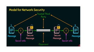 Computer data can be vulnerable when traveling between computers. Cryptography transforms data using secret codes and modern mathematics, making it safer during transmission. It provides security by encrypting data to protect confidentiality and ensuring integrity and authentication of messages. Common security threats include passive attacks like eavesdropping and traffic analysis, as well as active attacks like masquerading, message modification, denial of service, and replays. Cryptography addresses these using techniques like symmetric and public key encryption.