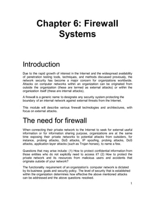 The document discusses firewall technologies and architectures. It begins by explaining the need for firewalls to protect internal networks from external threats. It then describes various firewall types including filtering routers, which inspect IP and TCP/UDP headers; stateful inspection, which tracks connection states; circuit gateways, which operate at the transport layer; and proxy servers, which break direct connections and mediate traffic. It provides examples of how each type of firewall works and their advantages and limitations. It also covers firewall configurations like the single-homed bastion system.