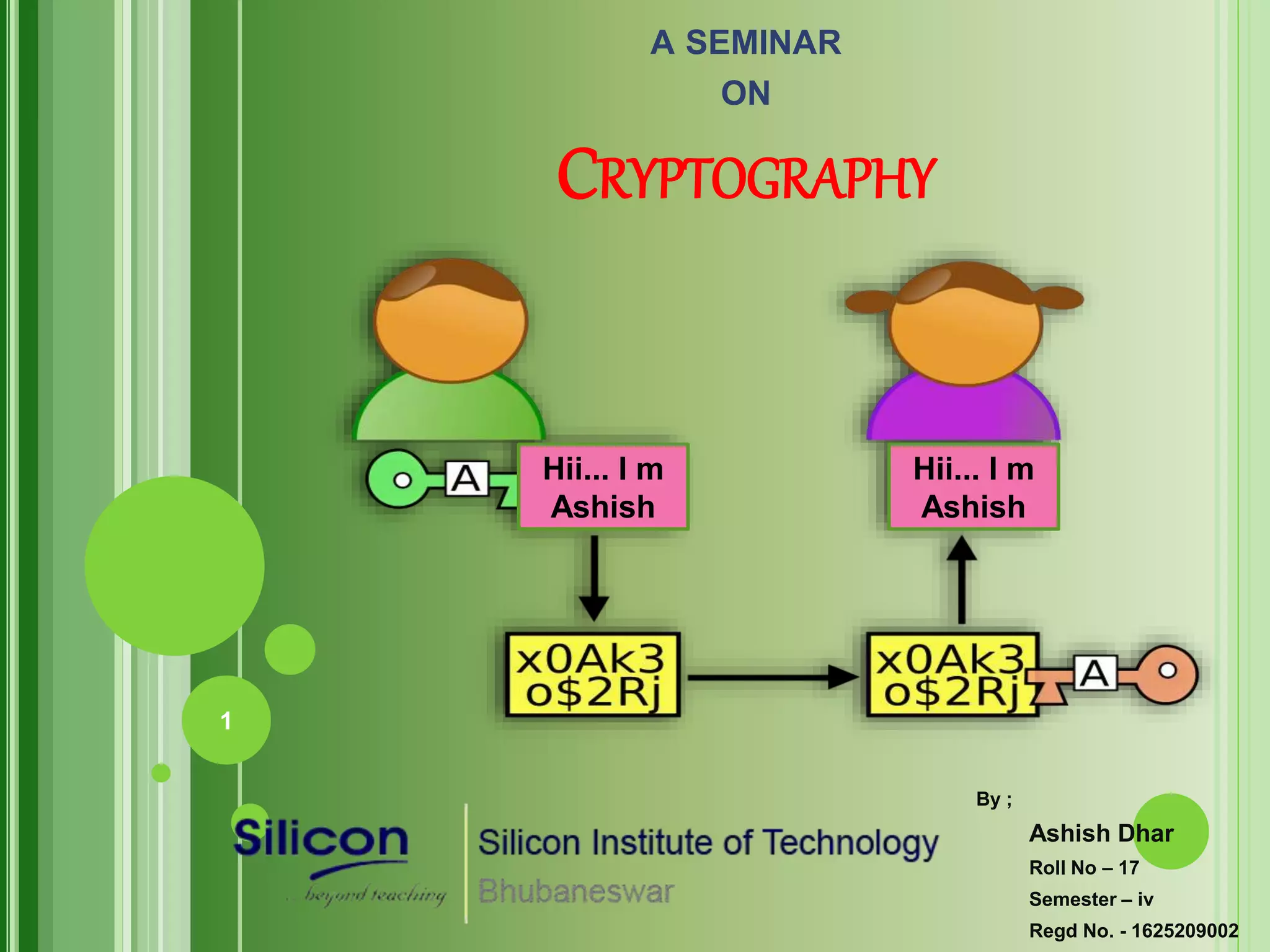 This document summarizes a seminar on cryptography presented by Ashish. It defines cryptography as the science of encrypting messages to make them secure. It outlines the basic terms used in cryptography like plaintext, ciphertext, encryption, and decryption. It describes the different categories of cryptography including secret key cryptography, public key cryptography, and hash functions. Popular algorithms for encryption like DES, AES, RSA, and algorithms for hashing like MD5 and SHA are also mentioned. Finally, it discusses applications of cryptography in areas like defense, e-commerce, and data security and provides references used for the seminar.