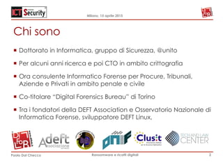 Il documento di Paolo Dal Checco esamina il fenomeno del ransomware e dei ricatti digitali, evidenziando come si siano evoluti dal 2012 con minacce sempre più sofisticate. Viene fornita una panoramica delle modalità di infezione, della diffusione e delle conseguenze per le vittime, evidenziando la difficoltà di prevenzione e le strategie di risposta. Infine, si discutono le misure di prevenzione e recupero dei dati, sottolineando l'importanza di backup e precauzioni nella gestione degli allegati email.