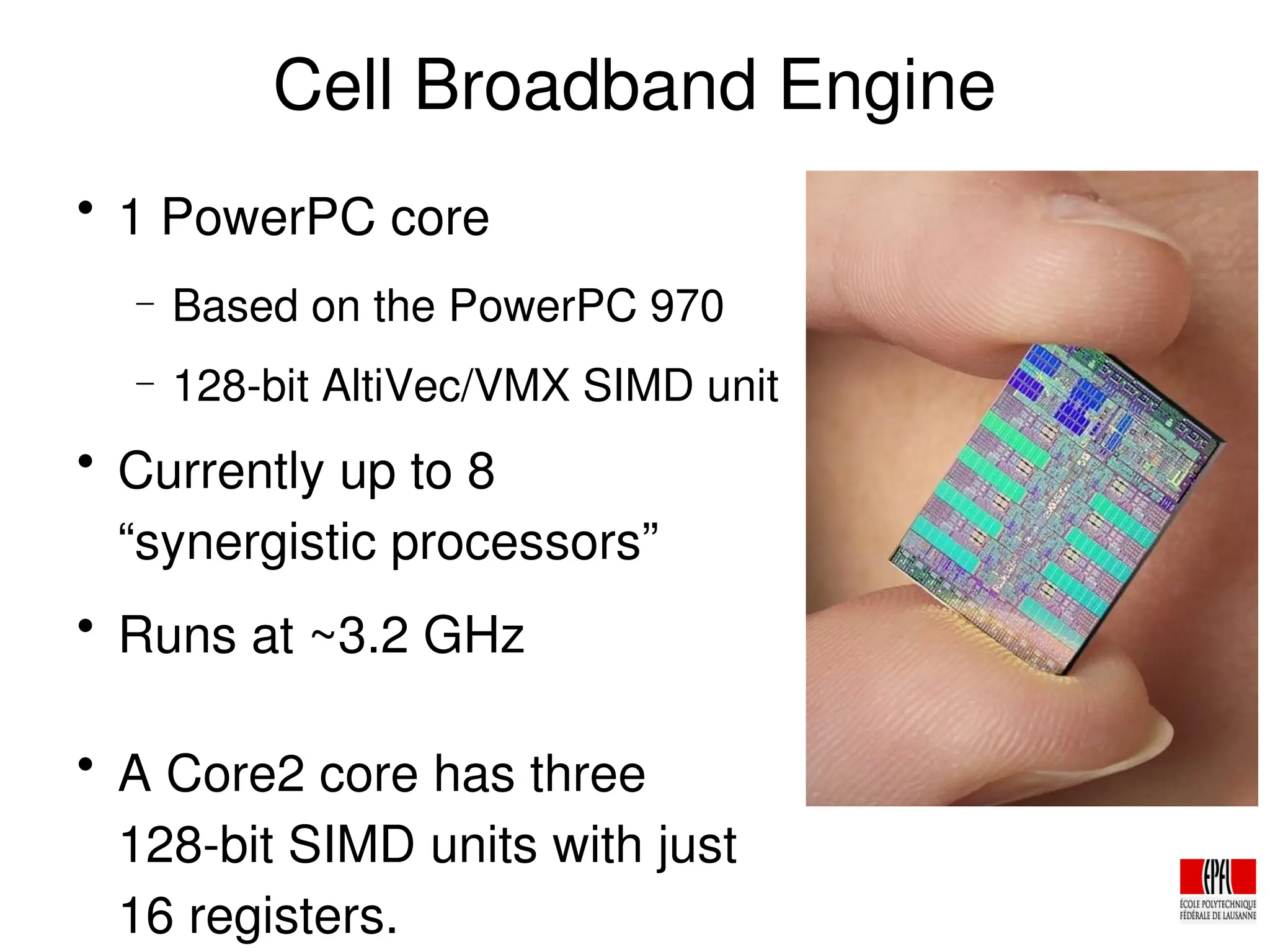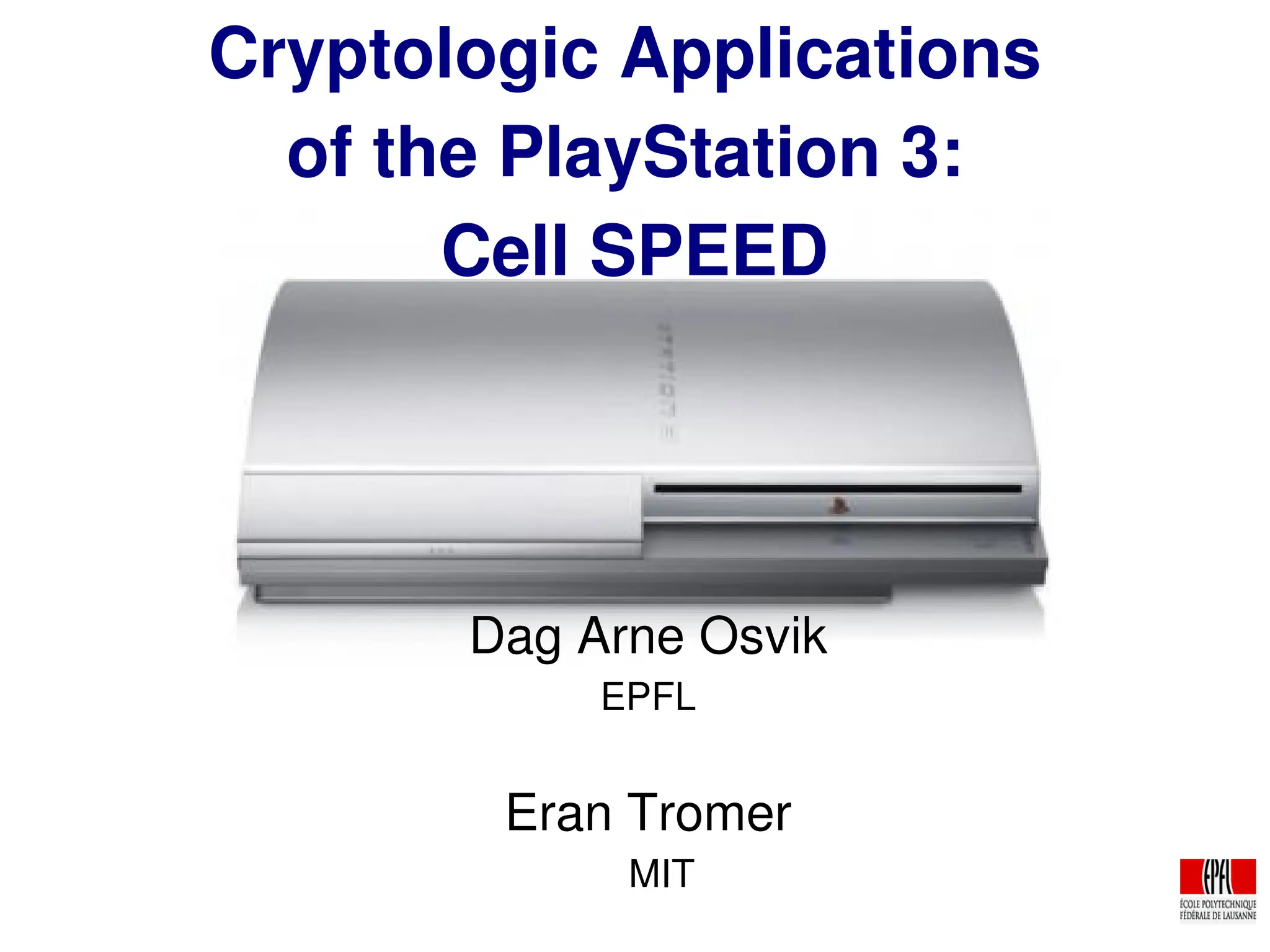 The document discusses the cryptologic applications of the PlayStation 3's Cell Broadband Engine, detailing its architecture, including the use of synergistic processors for cryptographic tasks like breaking DES and running AES with high throughput. It highlights performance metrics, such as the ability to perform 108 million keys/sec for DES and over 2.1 Gbit/sec for AES per SPU. Additionally, the document explores the potential future developments for the Cell, emphasizing enhancements in microarchitecture and memory capabilities to better support cryptographic applications.