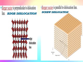 There are several types of crystal defects including point defects, line defects, surface defects, and volume defects. Point defects involve irregularities around a single atom and include vacancies, interstitials, and Frenkel and Schottky defects. Line defects are distortions along a line called dislocations including edge and screw dislocations. Surface defects occur on crystal surfaces and include grain boundaries, twin boundaries, and stacking faults. Volume defects involve larger clusters of missing atoms forming cracks, voids or non-crystalline inclusions. The presence of defects significantly impacts material properties like strength, ductility, and electrical conductivity.