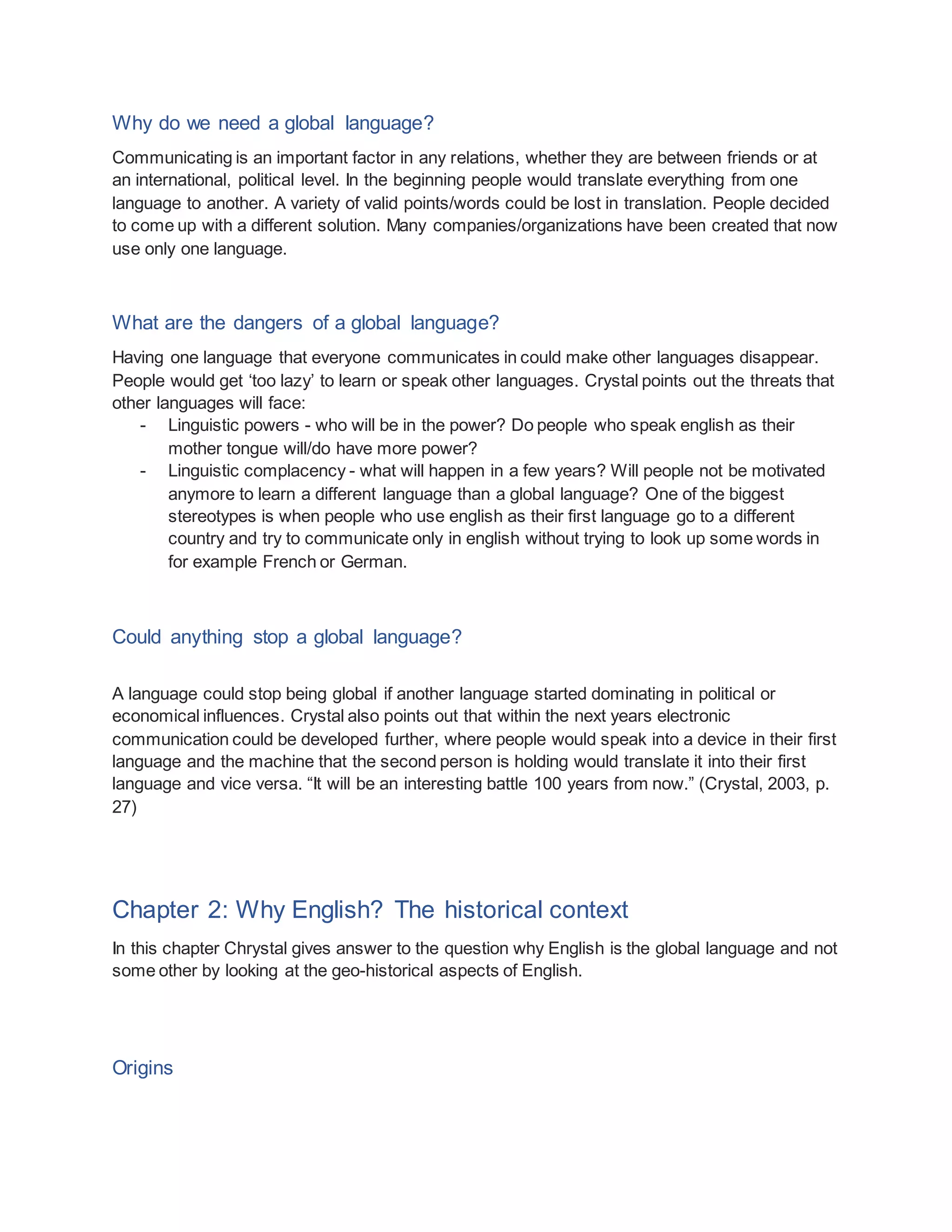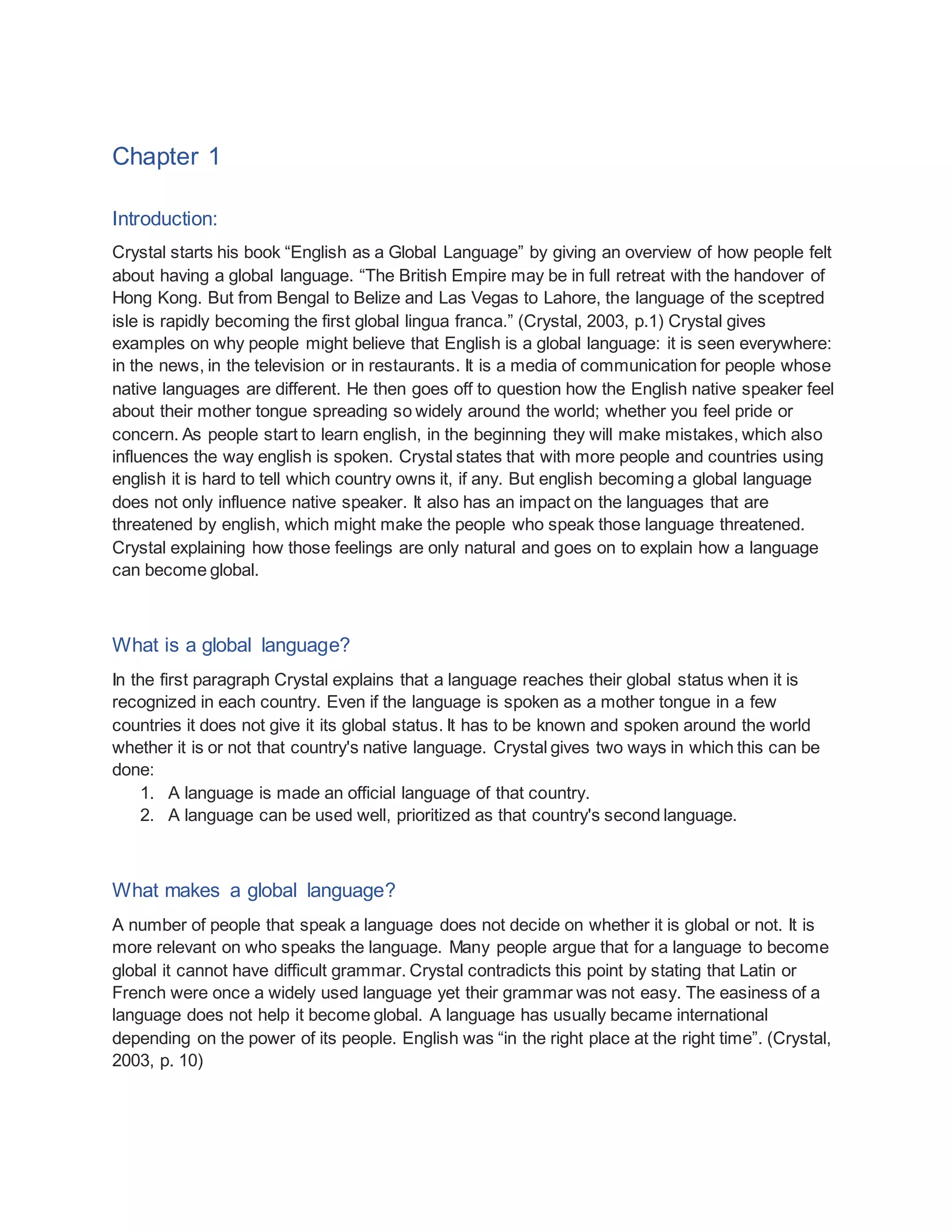 The document provides an overview of David Crystal's book "English as a Global Language" which examines how and why English has become a global language. It summarizes Crystal's arguments that a language needs widespread use and recognition across countries to be considered global, and that English attained this status due to the historical spread and power of Britain and other English-speaking countries through colonization and immigration. The document also discusses some of the dangers Crystal raises of a single global language dominating, such as endangering other languages and creating linguistic complacency.
