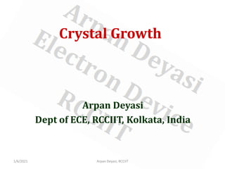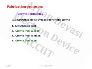This document discusses various techniques for crystal growth, including growth from melt, vapor, solution, and solid. It focuses on the Czochralski technique for silicon crystal growth from melt. This technique uses a seed crystal pulled slowly from a silicon melt to form a single crystal ingot. The document provides mathematical formulations to describe the technique and discusses advantages like growth of large oriented crystals and disadvantages like potential melt contamination. It also covers physical vapor deposition, chemical vapor deposition, and modern epitaxial techniques like molecular beam epitaxy.