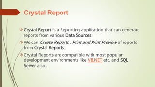 Crystal Reports allows users to generate reports from various data sources. It can create, print, and preview reports. Crystal Reports is compatible with development environments like VB.NET and SQL Server. The document then outlines 8 steps to develop a Crystal Report from a database by connecting to a data source, selecting tables, dragging and dropping fields, and previewing the report. Crystal Reports can link multiple databases and display relationships between tables.
