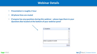 This document is a summary of a webinar on Crystal Reports for Sage HRMS that covered formulas and functions. The webinar was scheduled for 2:00pm EST and was roughly 1 hour long. The presenter was Mark Boutilier from Net@Work, who has over 30 years of experience in HR and payroll solutions. The agenda included recapping form creation using the wizard, options, special fields, formulas, functions like IF/THEN/ELSE and SWITCH(), and text functions like LEFT, MID, and RIGHT. Examples of reports using these features were also shown.