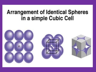 The document explains crystal structures, focusing on the arrangement of atoms in crystals through concepts such as Bravais lattices, unit cells, and Miller indices. It describes the seven crystal systems, close-packed structures, and specific configurations like diamond cubic, zinc blende, and rock salt. Additionally, it discusses the geometric characteristics of unit cells and methods to define crystal orientations and atomic arrangements within these structures.