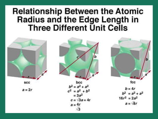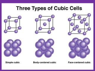 The document explains crystal structures, focusing on the arrangement of atoms in crystals through concepts such as Bravais lattices, unit cells, and Miller indices. It describes the seven crystal systems, close-packed structures, and specific configurations like diamond cubic, zinc blende, and rock salt. Additionally, it discusses the geometric characteristics of unit cells and methods to define crystal orientations and atomic arrangements within these structures.