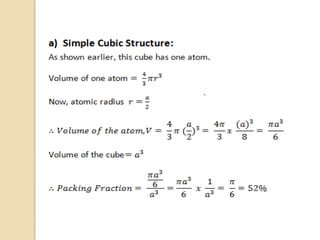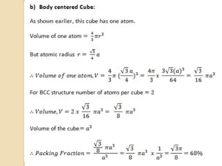 The document discusses the atomic arrangements in crystalline solids. It defines key concepts such as crystals, lattice, basis, unit cell, coordination number, Miller indices, and common crystal structures including simple cubic, body centered cubic, and face centered cubic. It provides examples of calculating the number of atoms in a unit cell, lattice parameter, atomic packing factor, atomic concentration, and drawing and identifying crystallographic planes from their Miller indices.