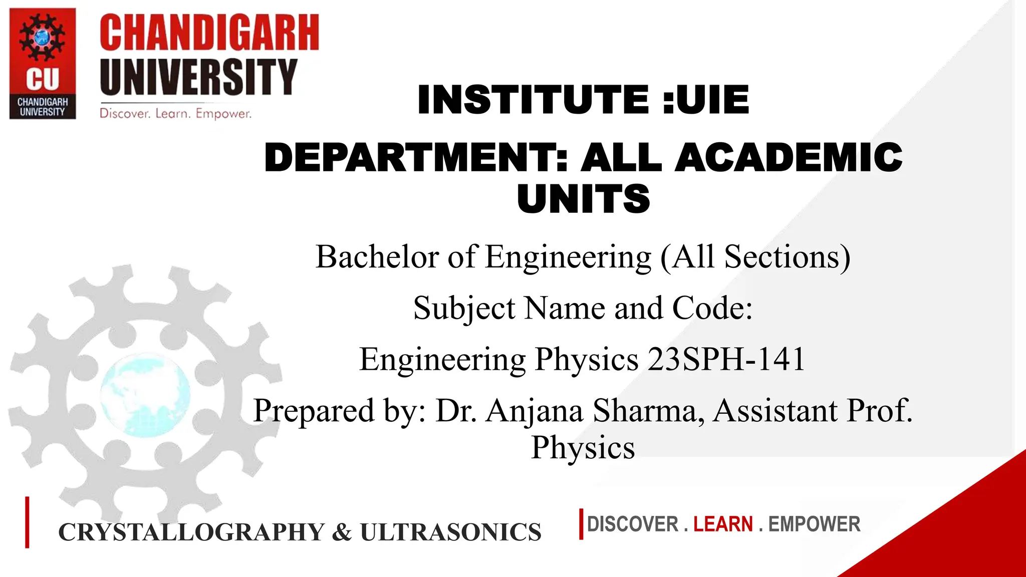 This document provides an overview of the Engineering Physics course on Crystallography and Ultrasonics. The objectives of the course are to make students industry-ready by teaching them fundamental concepts and applications of advanced engineering physics. The course structure includes topics on crystalline and amorphous solids, Bragg's law for X-ray diffraction, and applications of these principles such as in computed tomography, ultrasound, MRI, and PET scanning. Bragg's law states that constructive interference of electromagnetic waves occurs when the path difference of waves reflected from crystal planes is an integral multiple of the wavelength. The document also includes course outcomes, diagrams explaining concepts, examples, frequently asked questions, and references.