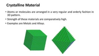 Crystalline materials have atoms or molecules arranged in a regular, orderly 3D pattern which gives them high strength, while non-crystalline materials have a random arrangement and lower strength. A crystal structure is a regular repetition of this 3D pattern defined by a unit cell and space lattice. Common crystal structures include simple cubic, body-centered cubic, face-centered cubic, and hexagonal close-packed. Crystal defects such as point defects, dislocations, grain boundaries, and voids are also discussed.