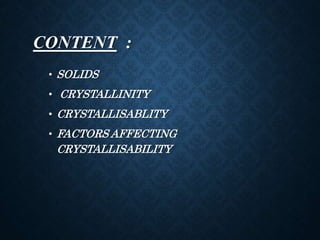 This document discusses crystallinity and factors that affect crystallizability in polymers. It defines crystalline and amorphous solids, and explains that polymers exist as both crystalline and amorphous regions. Crystallinity refers to the amount of crystalline regions relative to amorphous regions. Crystallizability is the maximum crystallinity achievable at a given temperature. Factors that affect crystallizability include the polymer's molecular structure, molecular weight, branching, cis/trans configuration, homo- or co-polymer composition, polarity, and presence of bulky side groups. Homopolymers with linear and alternating structures tend to be more crystalline, while randomness, branching, and bulky groups inhibit crystallization.