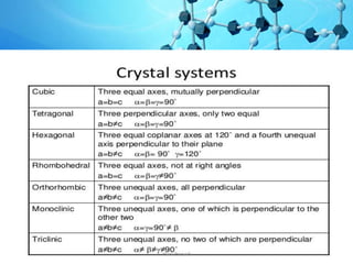 This document provides information on crystallography and the structure of crystalline solids. It defines key terms like crystalline solids, amorphous solids, space lattice, unit cell, and Bravais lattices. It describes the primary crystalline structures of metals including simple cubic, body centered cubic, face centered cubic, and hexagonal close packed. It provides details on the characteristics of each structure like atoms per unit cell, coordination number, and packing factor. Crystalline solids are described as having a regular orderly arrangement of atoms compared to the random arrangement in amorphous solids.