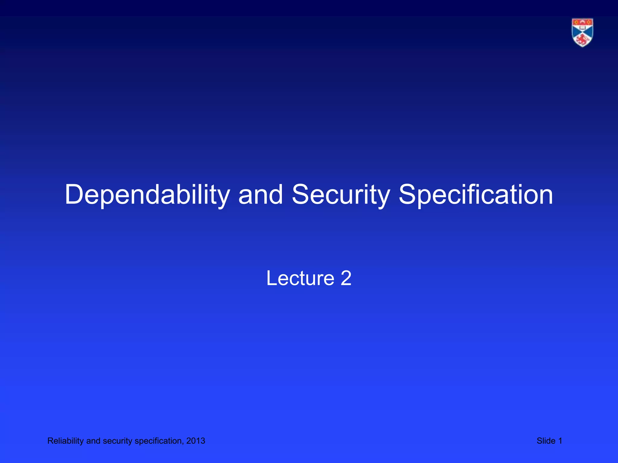 This document discusses reliability and security specification. It defines reliability metrics like probability of failure on demand, rate of occurrence of failures, mean time to failure, and availability. It describes the reliability specification process of risk identification, analysis, and decomposition to generate quantitative requirements. The document also discusses security specification, threat assessment, and defining security requirements to protect system assets. Formal methods for specification are introduced.