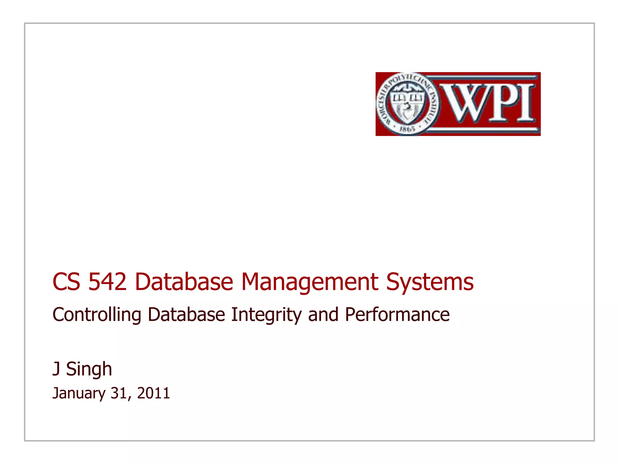 This document summarizes a lecture on database integrity and performance. It discusses various techniques for ensuring database integrity, including primary key constraints to prevent duplicate tuples, foreign key constraints to prevent dangling references, and attribute constraints to prevent inconsistent attribute values. It also covers views, which allow querying virtual tables, and indexes to improve query performance by enabling faster searching. The document proposes discussing index structures and report topics at the next meeting.