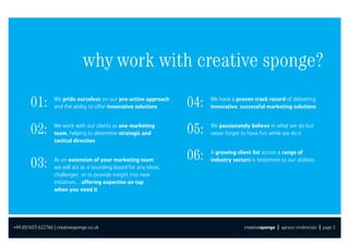 Creative Sponge is a marketing agency that prides itself on its proactive approach and innovative solutions. It works closely with clients as an extension of their marketing team, providing strategic guidance and expertise. The agency has a proven track record of delivering successful marketing campaigns across various industries, as shown by its growing client list and portfolio of work.