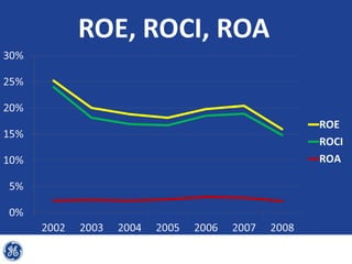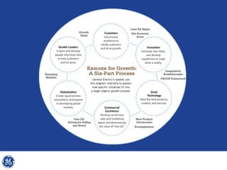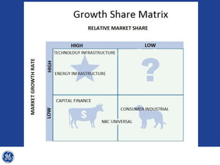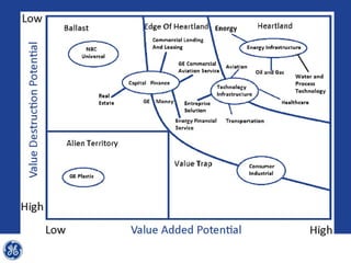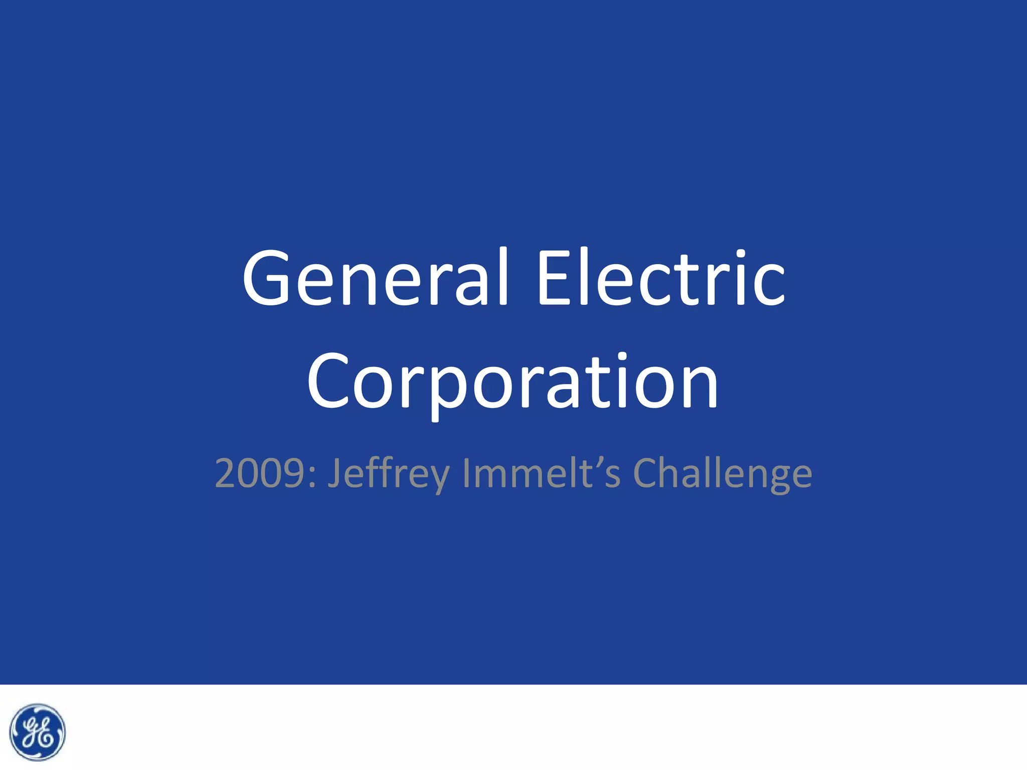 This document provides an overview and analysis of General Electric's strategies under CEO Jeffrey Immelt from 2001-2009. It discusses Immelt's core strategies of growth, integration, and value creation. It analyzes GE's financial performance and portfolio from 2008 including revenues, profits, assets and debt. It recommends reducing reliance on GE Capital, increasing renewable energy investment, and selling NBC Universal while continuing international expansion.