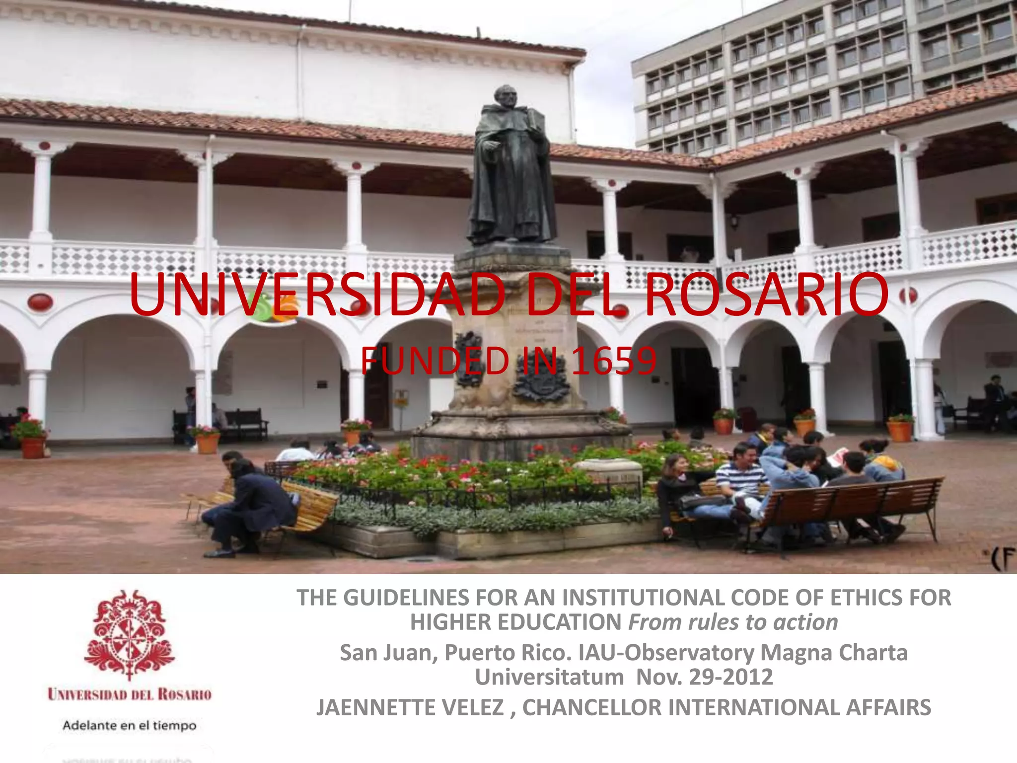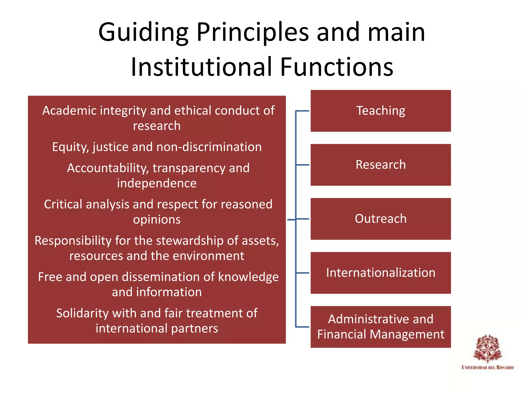 The document summarizes the guidelines for an institutional code of ethics at Universidad del Rosario in Colombia. It outlines the university's guiding principles, which include academic integrity, equity, accountability, critical thinking, social responsibility, and transparency. It then provides examples of how the university upholds and promotes these principles through policies, programs, and initiatives related to research conduct, non-discrimination, transparency, academic freedom, and social outreach.