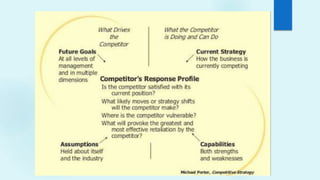 This document provides an overview of competitor analysis. It discusses analyzing a competitor's goals, assumptions, strategy, and capabilities. The goals section explains that understanding a competitor's present and future aims allows predicting their satisfaction with their position and reactions to strategic changes. Assumptions are the most crucial to analyze, regarding how competitors view themselves and the industry. Key indicators of assumptions include a competitor's history, leadership backgrounds, and relationships. The document also outlines analyzing a competitor's current explicit and implicit strategies across functions, and their core capabilities, ability to grow, respond quickly, adapt to change, and maintain operations over time.