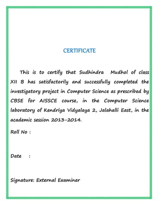 The document certifies that Sudhindra Mudhol of class XII B has successfully completed an investigatory project in computer science at Kendriya Vidyalaya 2 during the 2013-2014 academic session. It includes acknowledgments to teachers and descriptions of project requirements, source code, and functions related to a 'Star Billing System' program written in C++. The project involves file handling and provides functionalities for managing shop items, including adding, modifying, and displaying products, along with generating customer slips.