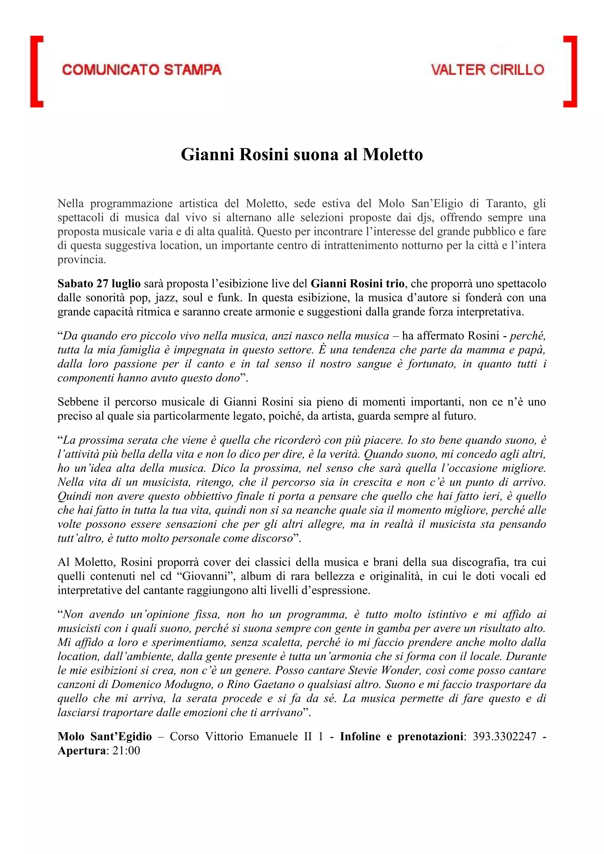 Gianni Rosini si esibirà dal vivo al Moletto, una location estiva a Taranto, il 27 luglio, con un concerto che mescola pop, jazz, soul e funk. Il musicista, che proviene da una famiglia di artisti, vive la musica come una continua crescita senza un obiettivo finale, con l'intento di offrire un'esperienza unica e personale al pubblico. Durante il concerto, Rosini proporrà sia cover che brani originali, lasciandosi guidare dall'energia della location e del pubblico.