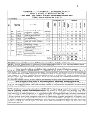 This document outlines the scheme of teaching and examinations for the third through eighth semesters of the Bachelor of Engineering program in Computer Science and Engineering at Visvesvaraya Technological University. It details the courses offered each semester, including core courses in the major, labs, electives, and other requirements. Evaluation is based on continuous internal assessment and semester end exams. Provisions are included for lateral entry students and activity point requirements for degree completion.