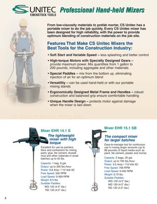 CS Unitec offers a line of portable mixers and mixing stations for construction jobsites. Their mixers are designed for reliability and power to blend various construction materials. Larger mixers can mix quantities up to 200 pounds, while portable mixing stations allow one person to mix, transport, and pour materials directly onto the floor. CS Unitec also provides dust extraction vacuums and concrete grinders to work with their mixers for complete mixing and surface preparation solutions.
